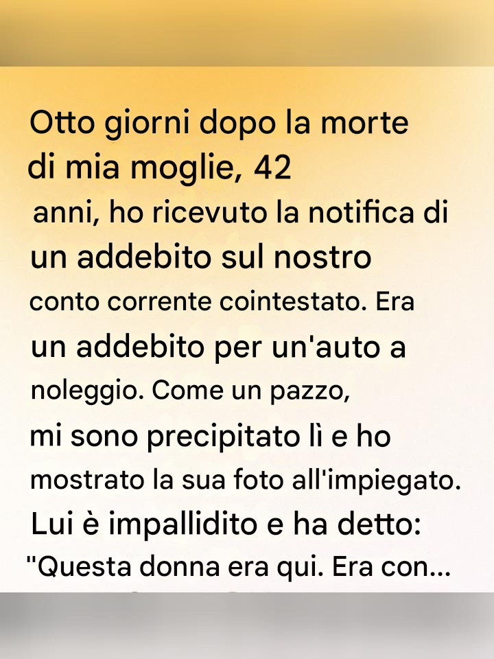 Erano passati otto giorni dal funerale. Otto giorni in cui avevo scoperto che il silenzio non è vuoto, che opprime, che riempie le stanze, che ti ronza nelle orecchie quando il mondo smette di chiederti come stai. Avevo appena iniziato a imparare a respirare in quel silenzio quando l'ho visto.